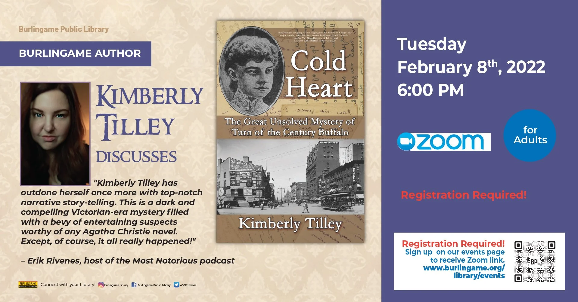 Join us on Zoom to hear Burlingame author Kimberly Tilley discusses her historical true-crime book Cold Heart about tycoon Ed Burdick's murder in 1903 while his family slept upstairs.