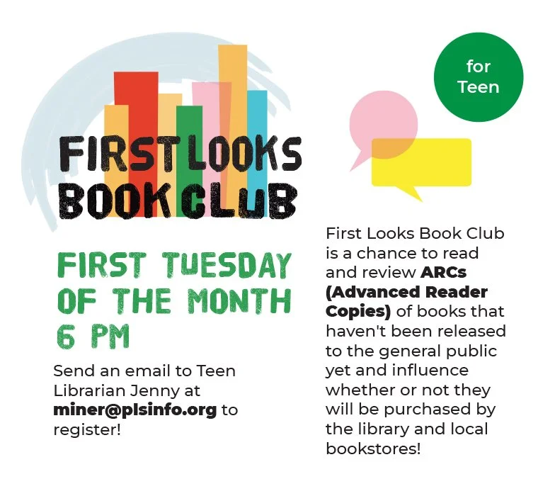 We meet the first Tuesday of every month (over Zoom, for now) at 6pm. Send an email to Teen Librarian Jenny at miner@plsinfo.org to register!